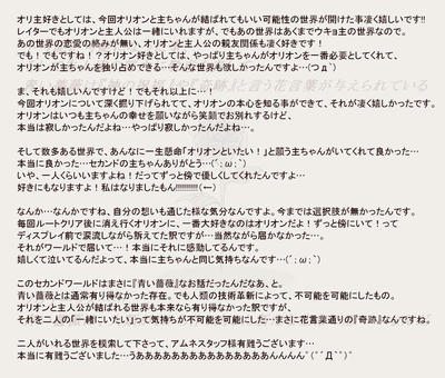 オリオンはね、ずっと他の世界(レイター以外)では主ちゃんに忘れられる存在だから。一方的に見守る事しかできなかったから。